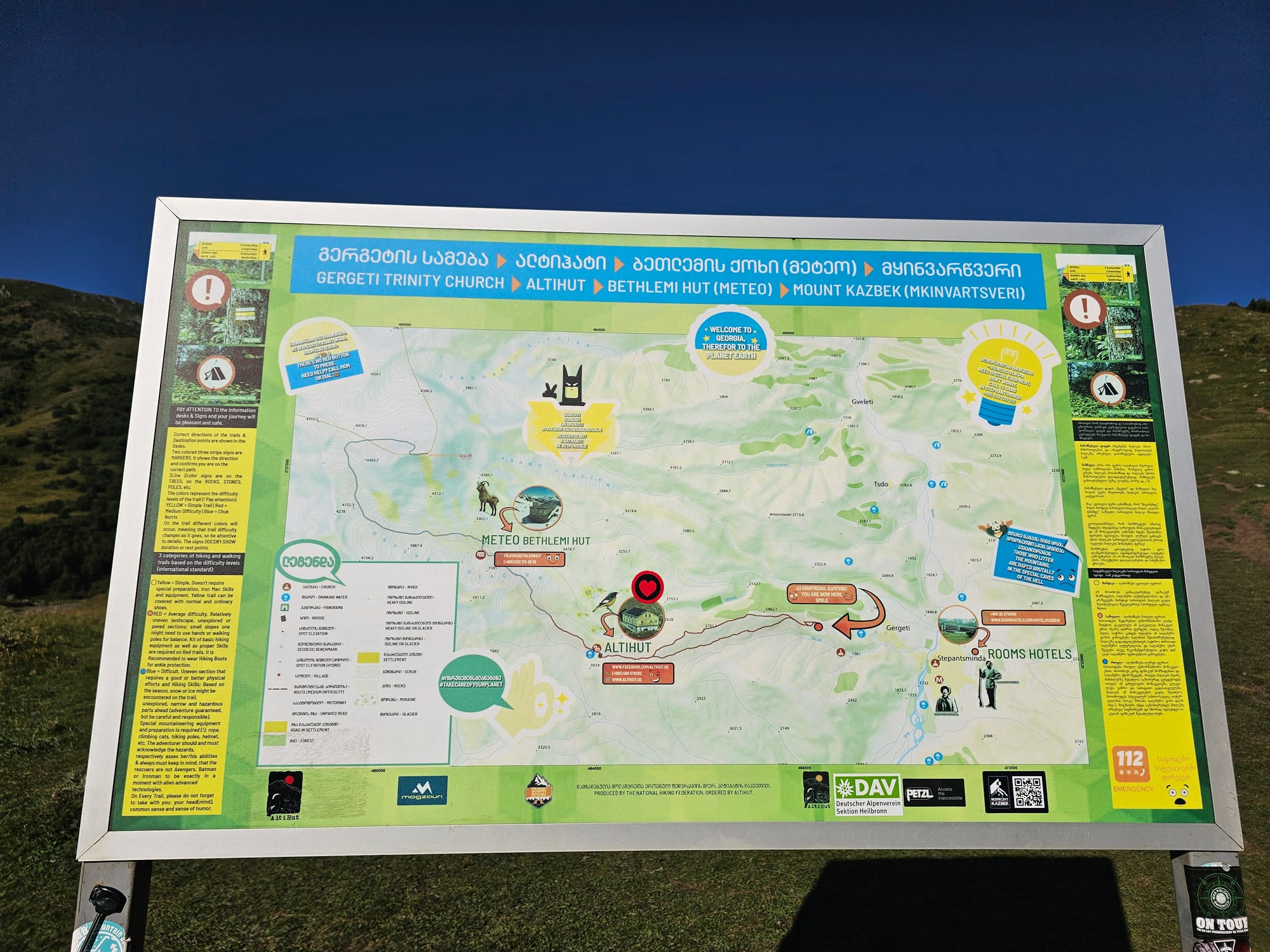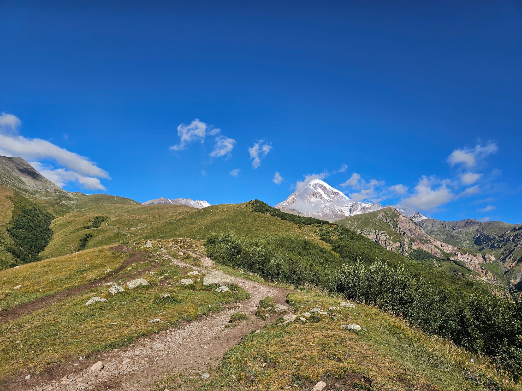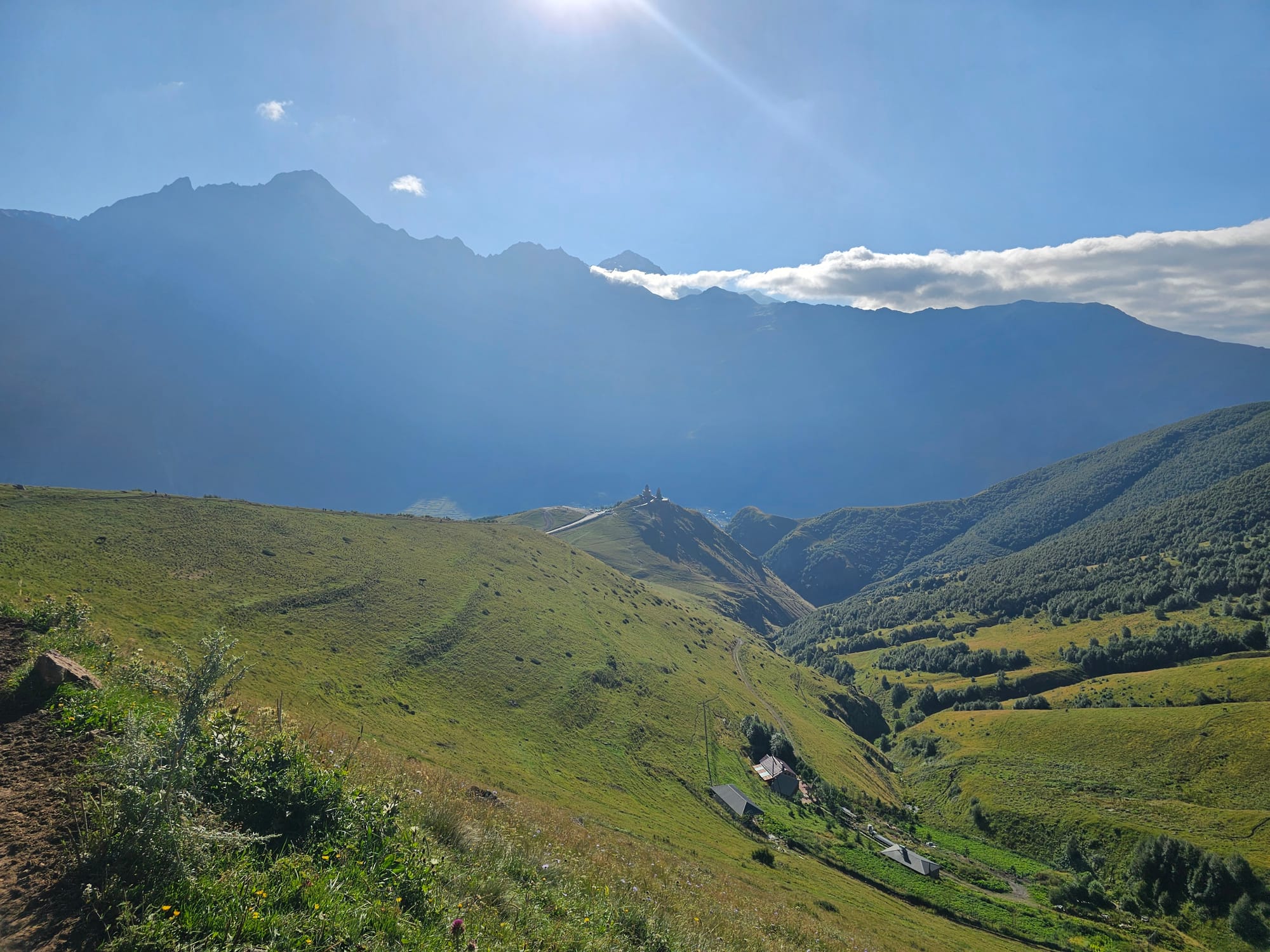 Этот хайк я запланировала самым первым. Он продолжение нашего первого хайка в Степанцминде, когда мы дошли до церкви, но идти все это за раз точно было слишком сложно для нас, даже так подъем и спуск получались больше 1000 м. Наш план минимум был дойти до горной хижины Alti-Hut, план максимум — до ледника.