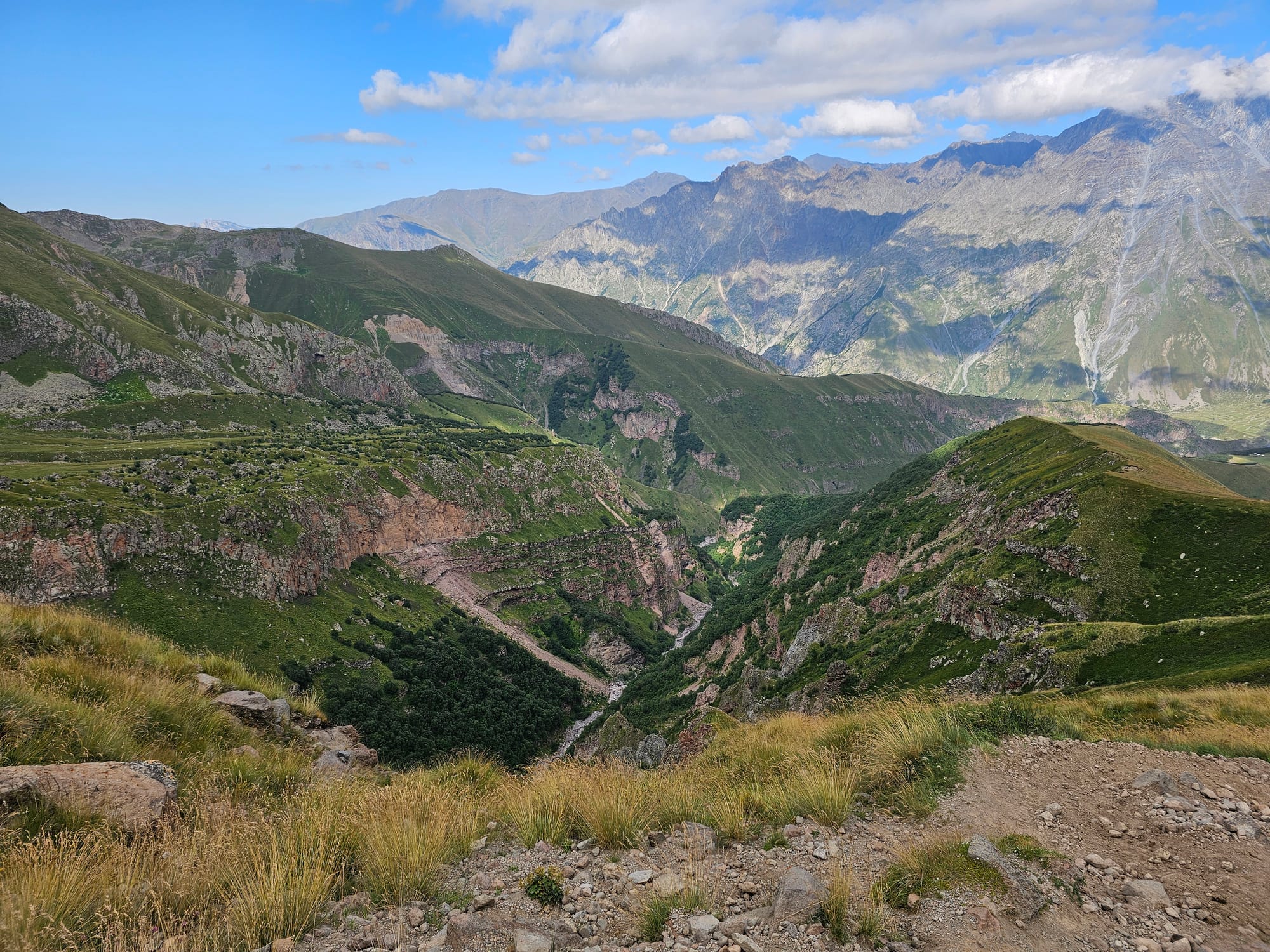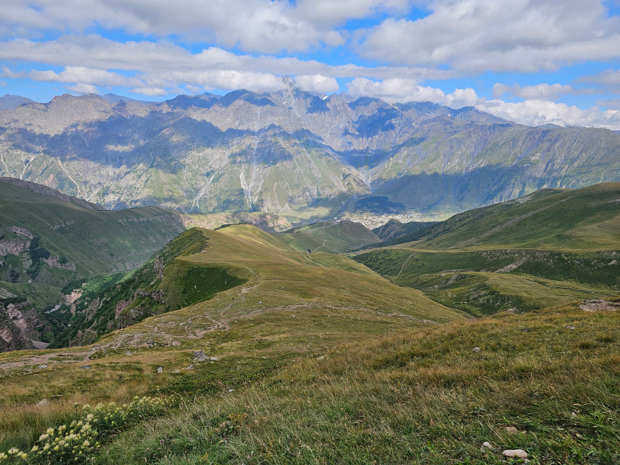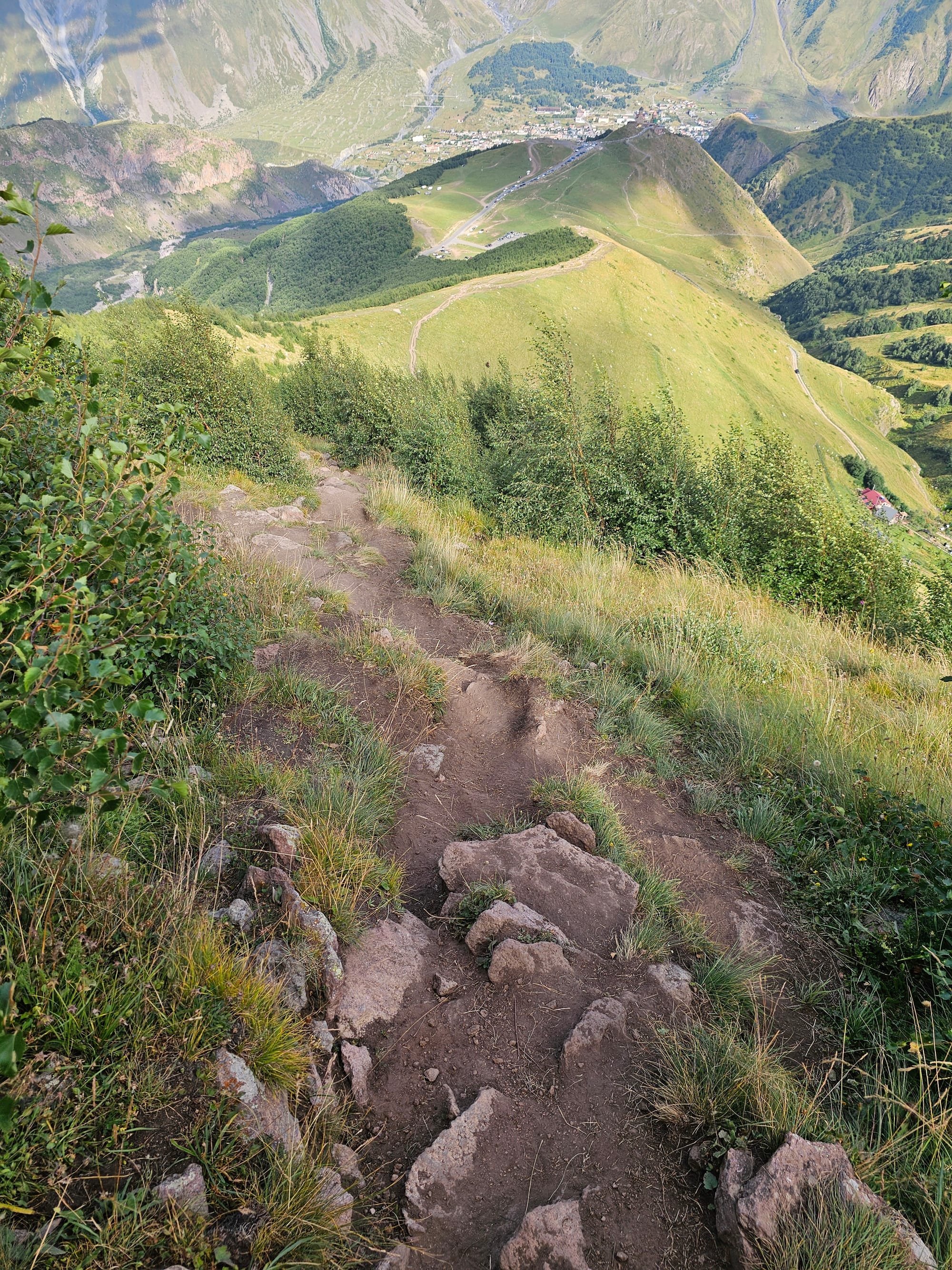Этот хайк я запланировала самым первым. Он продолжение нашего первого хайка в Степанцминде, когда мы дошли до церкви, но идти все это за раз точно было слишком сложно для нас, даже так подъем и спуск получались больше 1000 м. Наш план минимум был дойти до горной хижины Alti-Hut, план максимум — до ледника.