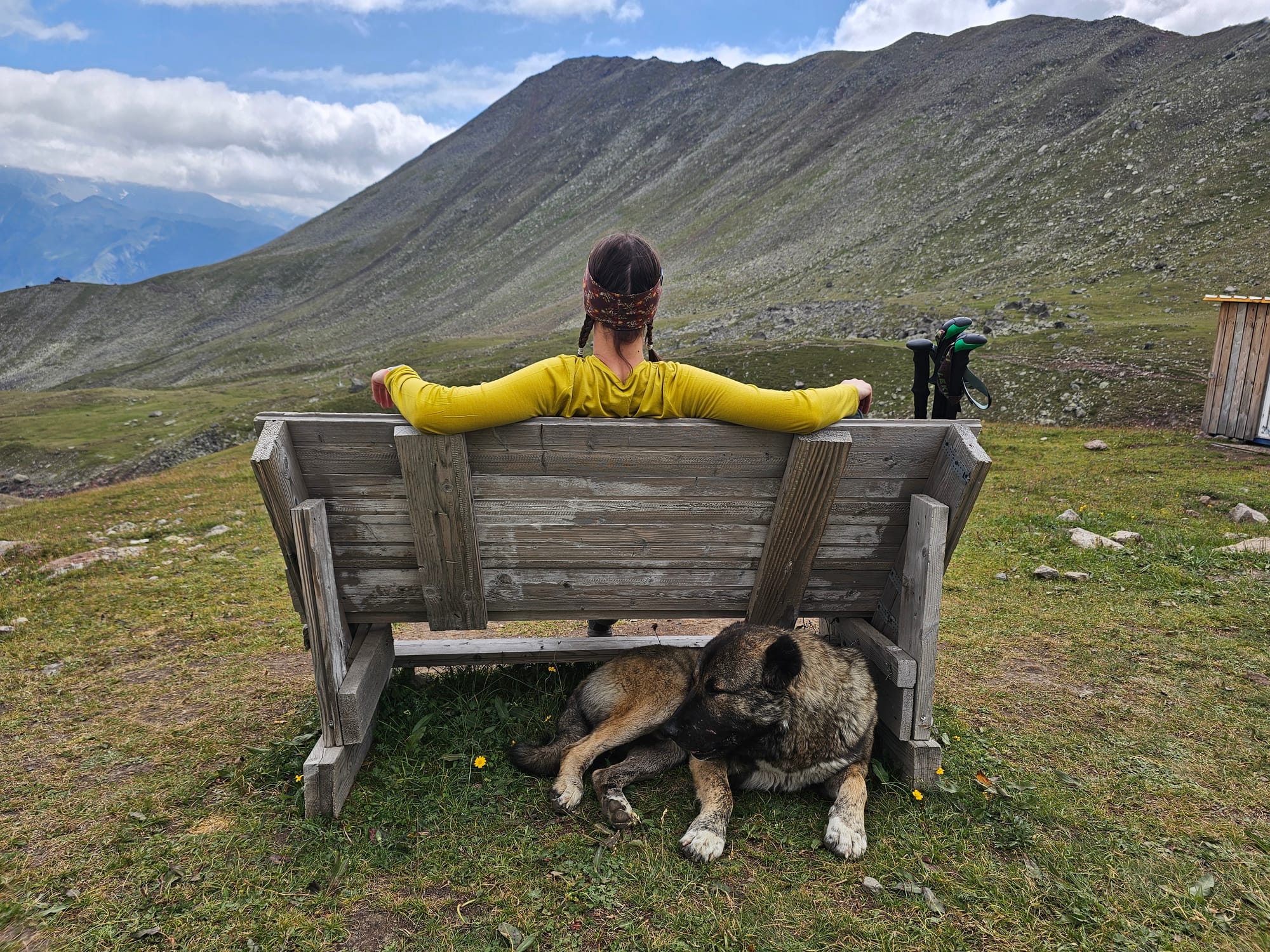 Около хижины была лавочка с красивым видом назад, мы решили пофоткаться на ней, и, пока я фотографировала маму, огромная местная собака устроилась прям за лавочкой, так что у нас теперь шикарные кадры с этой собакой.