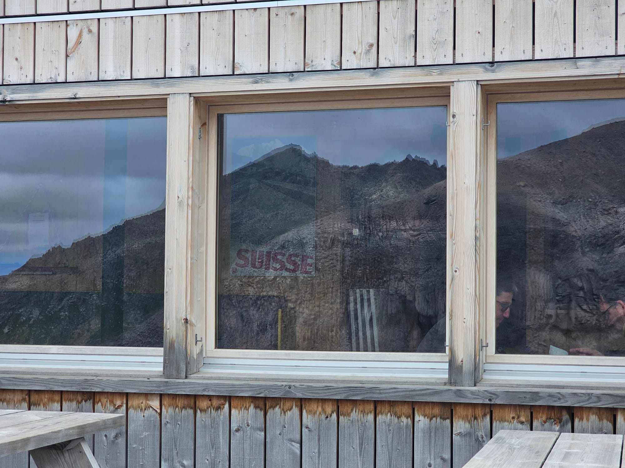 Мы совсем недавно останавливались в кафе, так что решили было не заходить в хижину... но сквозь ее окно я увидела плакат с надписью SUISSE.