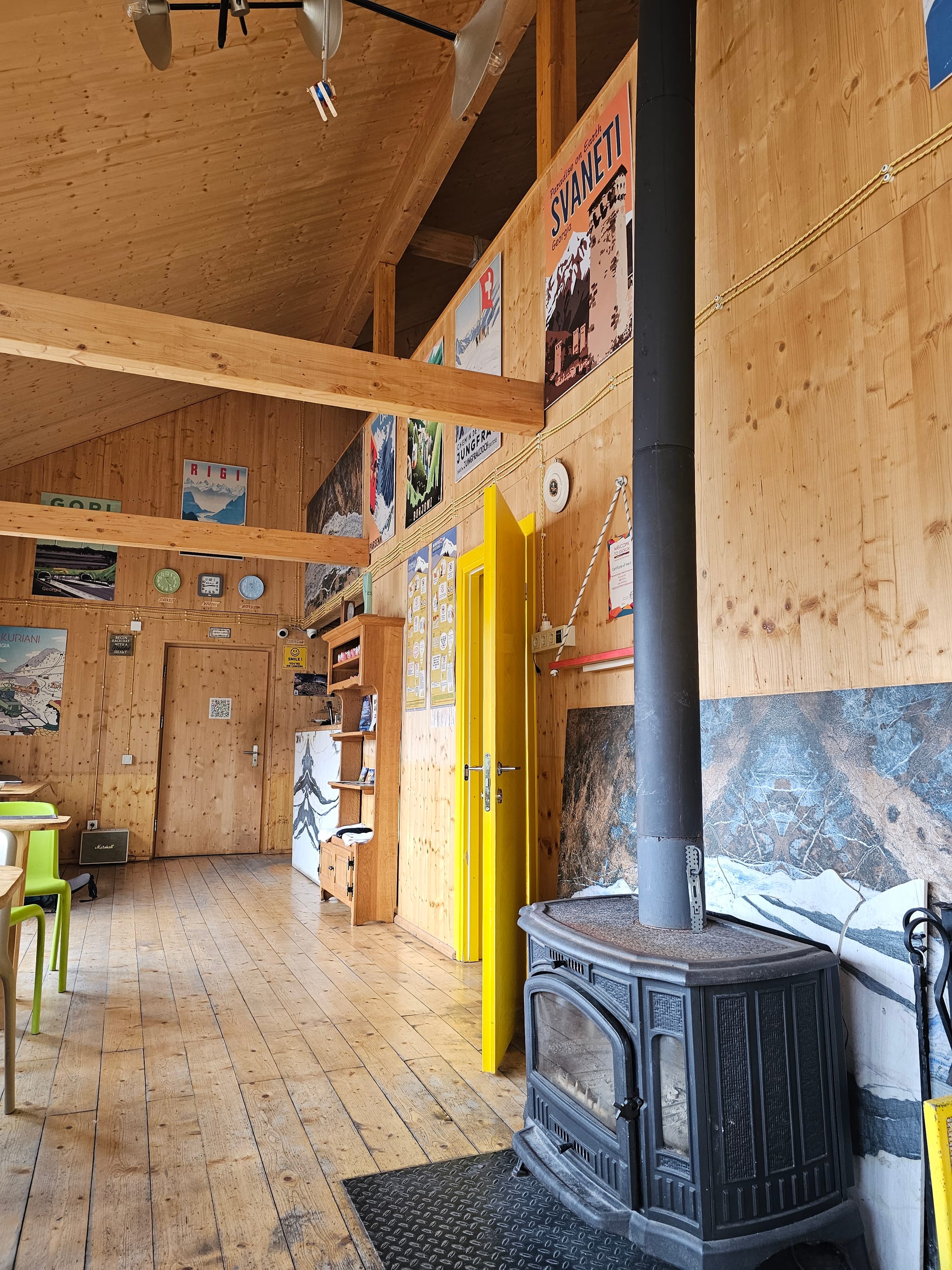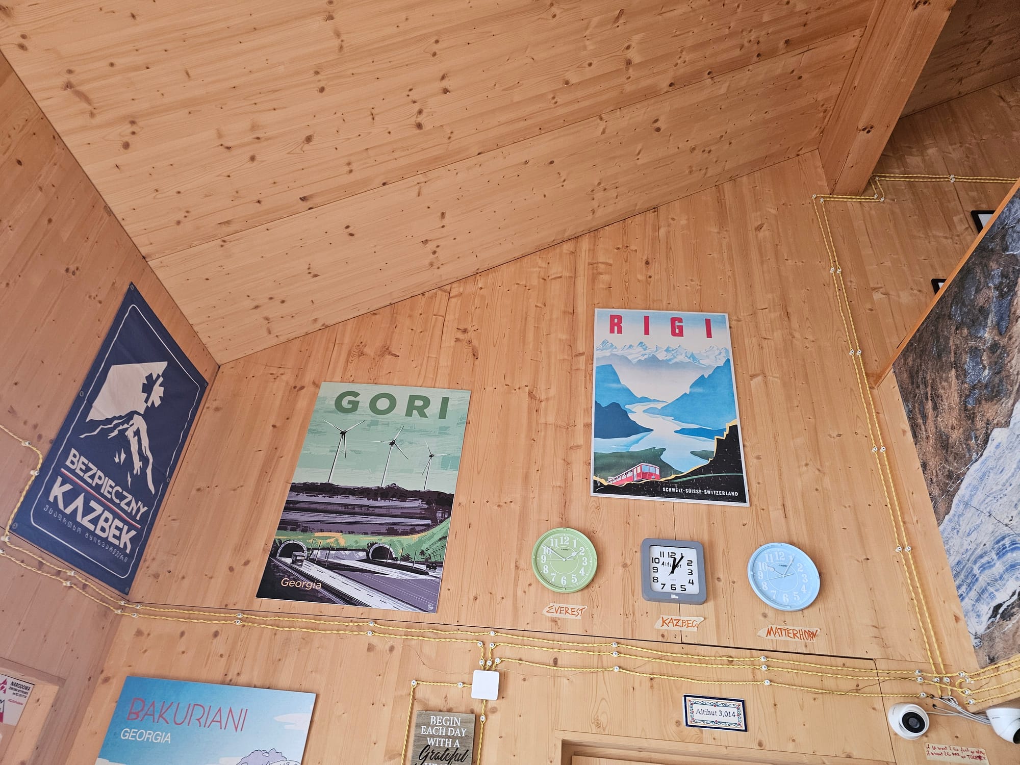 Теперь я уже не могла откладывать визит в хижину, срочно пошла смотреть и разбираться. Оказалось, что хижину проектировали и строили в Швейцарии, а потом перевезли и собрали на месте в Грузии. Поэтому внутри висят плакаты с разными грузинскими и швейцарскими известными горными местами, а еще там висят часы, которые показывают время на Казбеги, Маттерхорне и Эвересте.