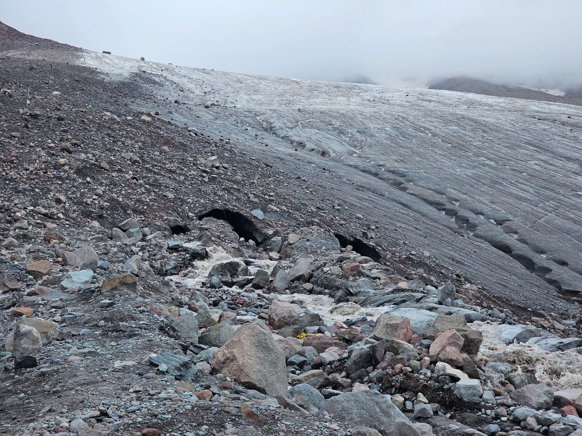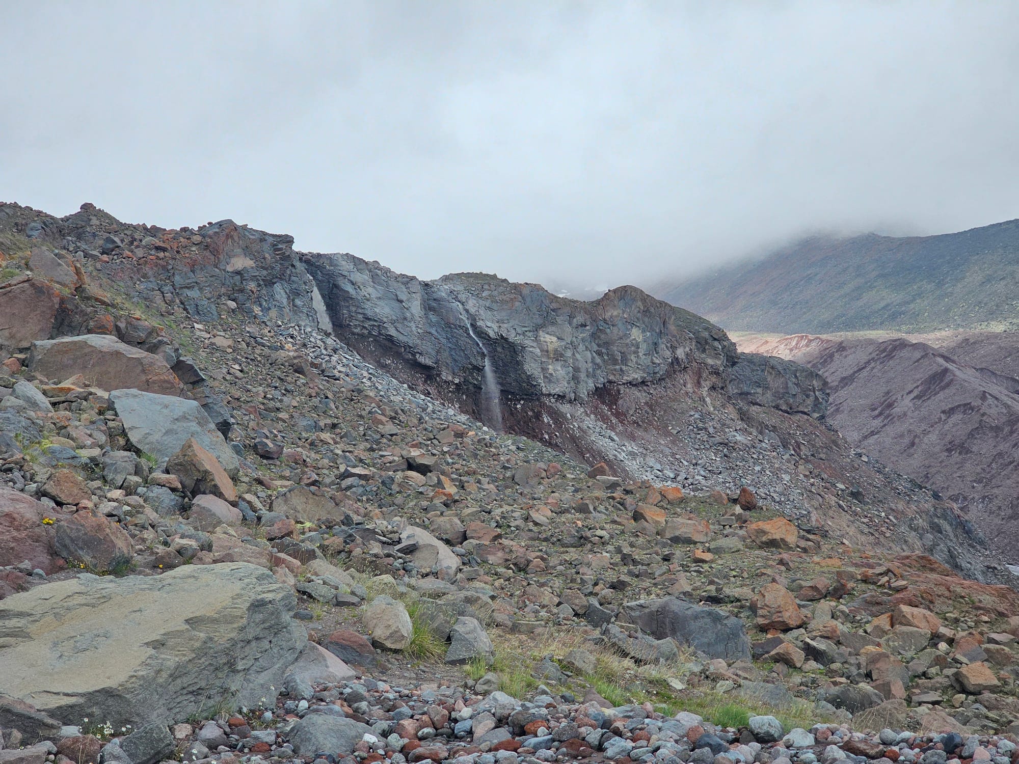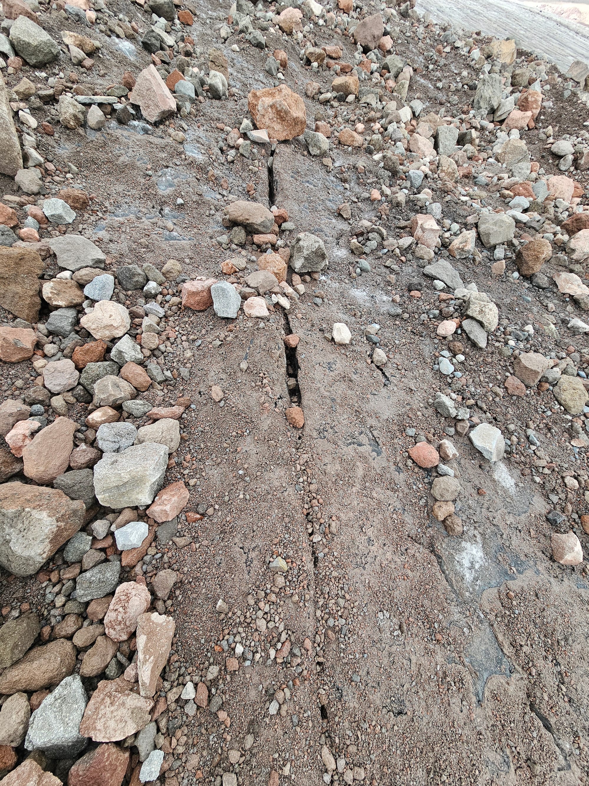 И тут мы внезапно обнаружили, что мы не сбоку от ледника, а практически на нем! Земля под ногами была промерзшая, мы прям увидели лед и трещины в нем!!