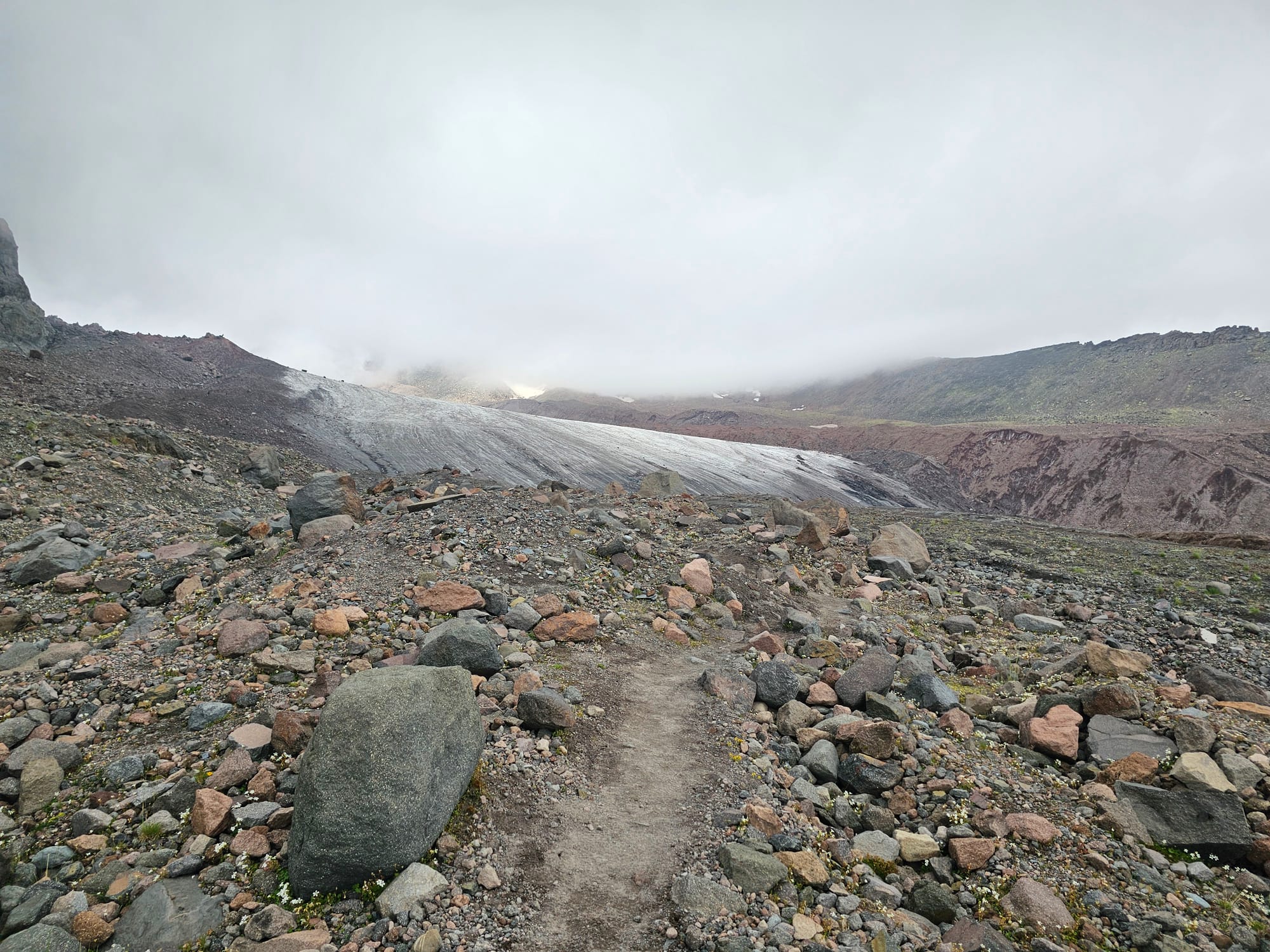 Вторая же тропа вела слегка вбок, и мы видели там людей, тусящих в стороне от ледника, решили, что это то, что нам надо, чтобы дойти до той же высоты, где ледник, но не выходить на него.