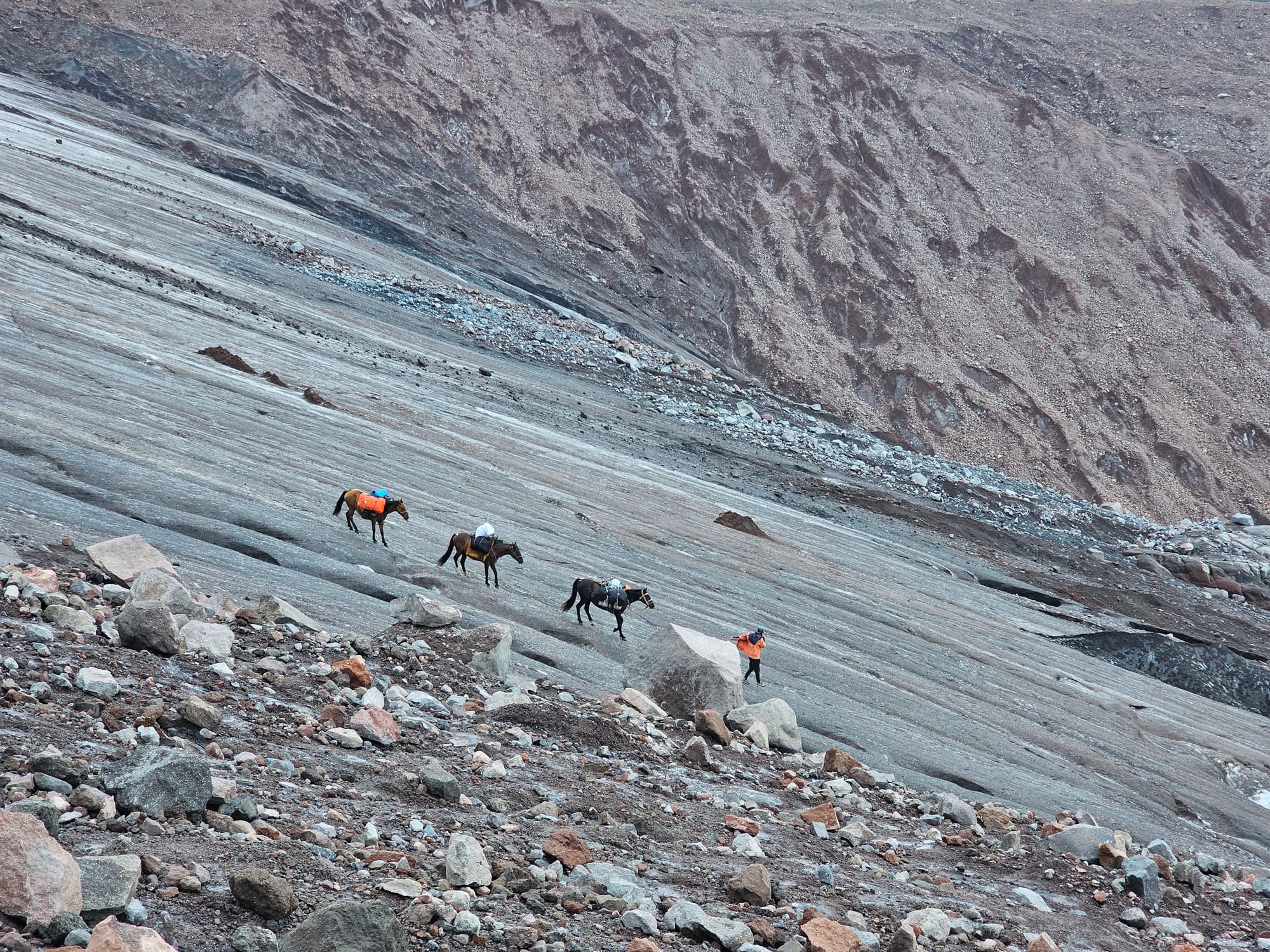 Но нам предстояло еще дойти до ледника. Его уже было видно, но тропа стала сложнее и хуже видна. Кроме этого, приходилось пересекать текущую от ледника реку. Один раз мы свернули не туда, но потом разобрались. Еще в какой-то момент тропа разошлась. Одна, более сложная, шла прям к леднику, туда шли все лошадиные группы, которые мы видели. С большим удивлением мы посмотрели, как лошади идут по леднику вверх и вниз! Причем если вниз люди, их сопровождающие, слезают и идут пешком впереди лошадей, то вверх они просто продолжают сидеть на лошади.