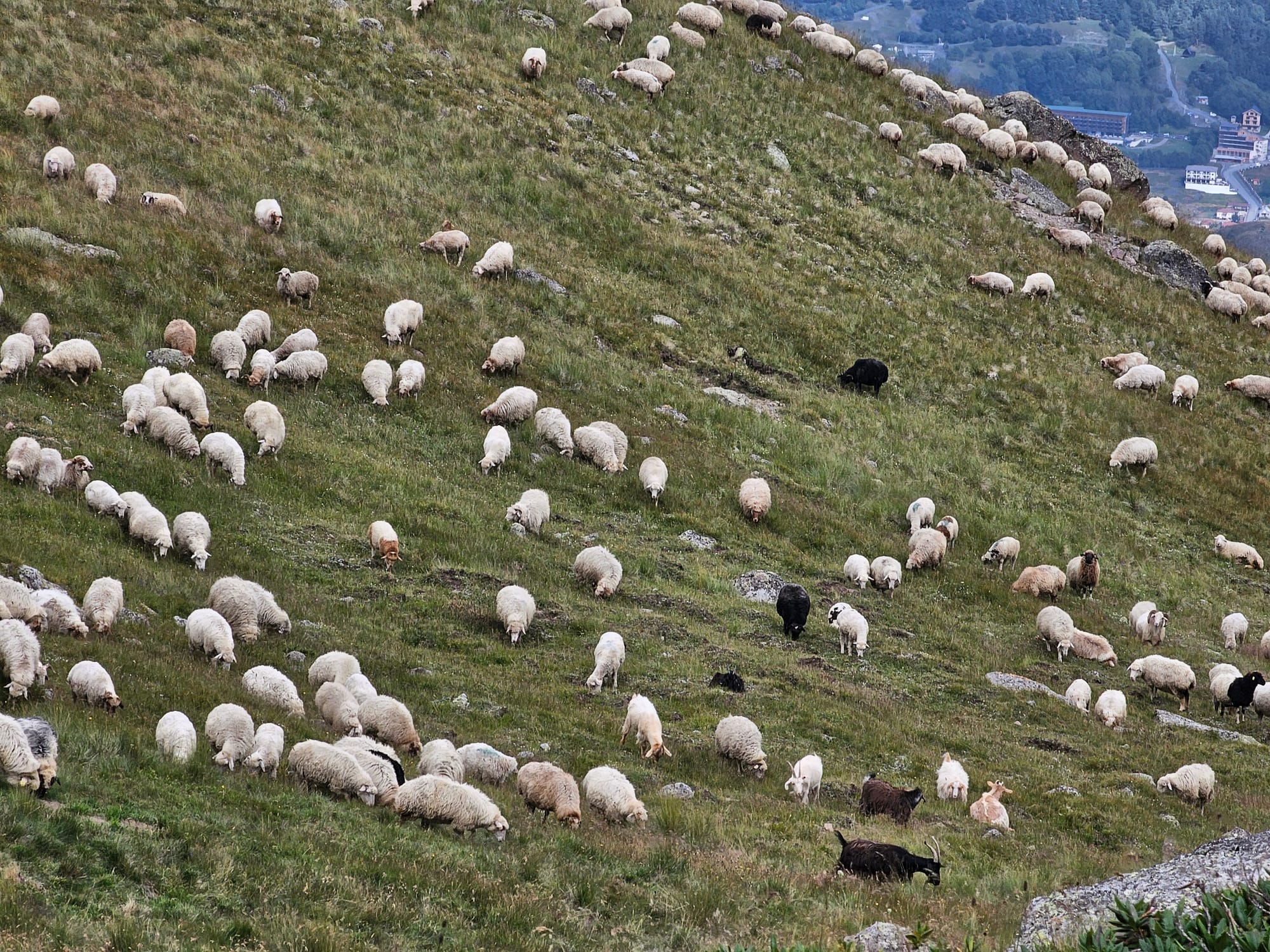 Снова дойдя до кафе мы свернули в другую сторону, чтобы спуститься по новой тропе. И быстро снова оказались около стада овец. В этот раз оно было гораздо ближе, но из-за этого мы смогли разглядеть, что черные животные с овцами это не собаки, а козлы. Ну и некоторые овцы были черными.