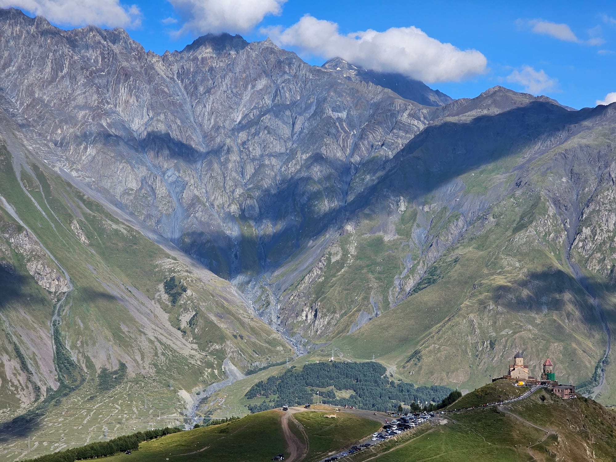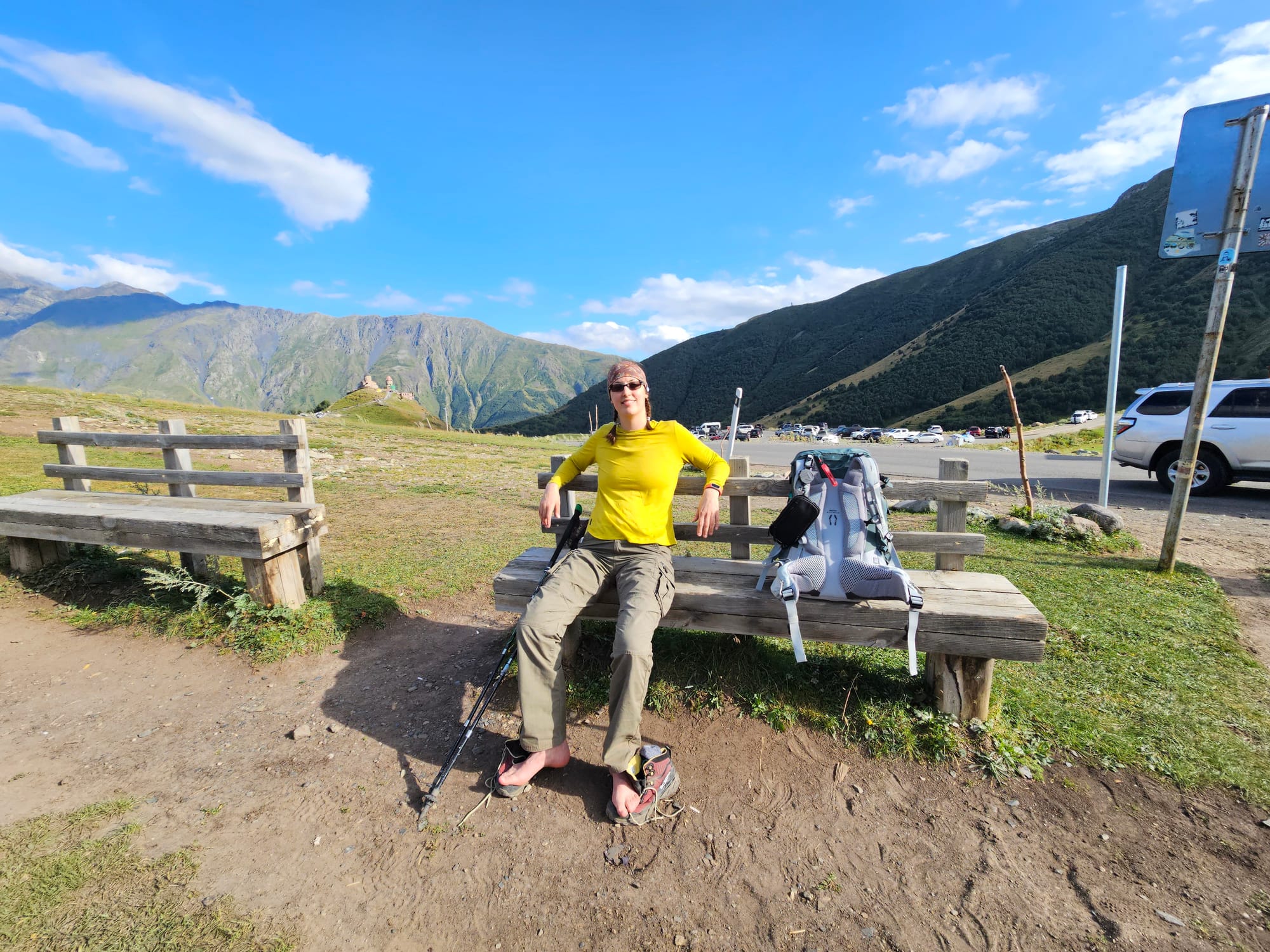 Добравшись до церкви, мы нашли лавочки и упали на них. Сил двигаться не было, так что мы просто сидели, чилили и ждали машину. И немного обсуждали хайк. Оказалось, что каждая из нас думала, что другая-то справится с маршрутом. Я знала, что мама уже ходила маршруты такой сложности, а я еще нет. Поэтому я была уверена, что у нее все ок будет, а вот мне может быть слишком тяжело. А она знала, что я летом много разных маршрутов ходила и была довольно расхоженной, поэтому она была уверена, что у меня-то все ок будет, а вот ей может быть слишком тяжело. Но по итогу, мы очень хорошо похайкали в первые дни в Степанцминде, дали себе отдохнуть в день перед этим хайком, и все прошло максимально здорово. Очень довольны, что выбрались в этот хайк.