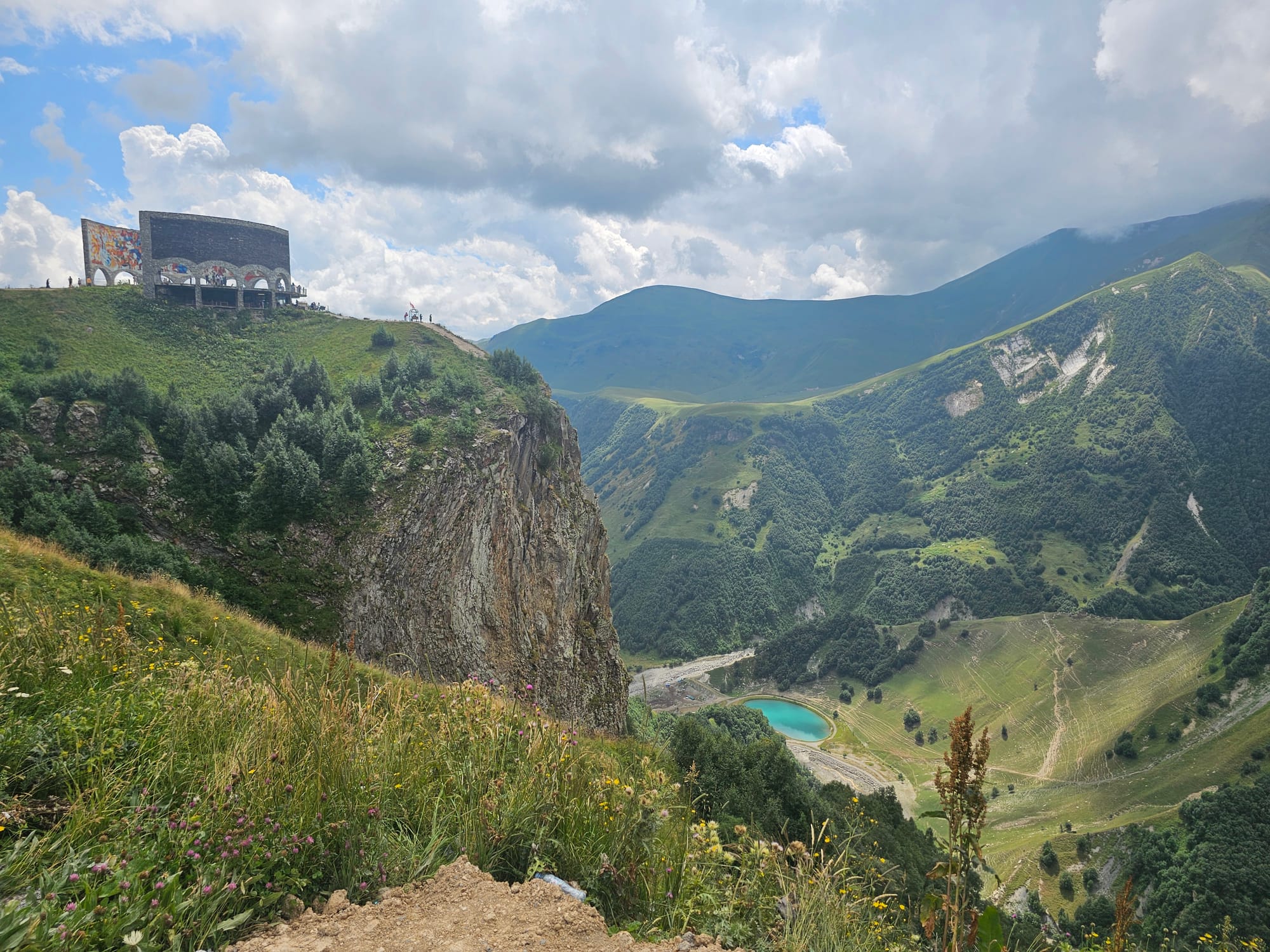 Дальше дорога шла через Крестовый перевал (2379 м). У нас были остановки около Арки Дружбы, где открывается красивый вид на долину реки Белая Арагви...