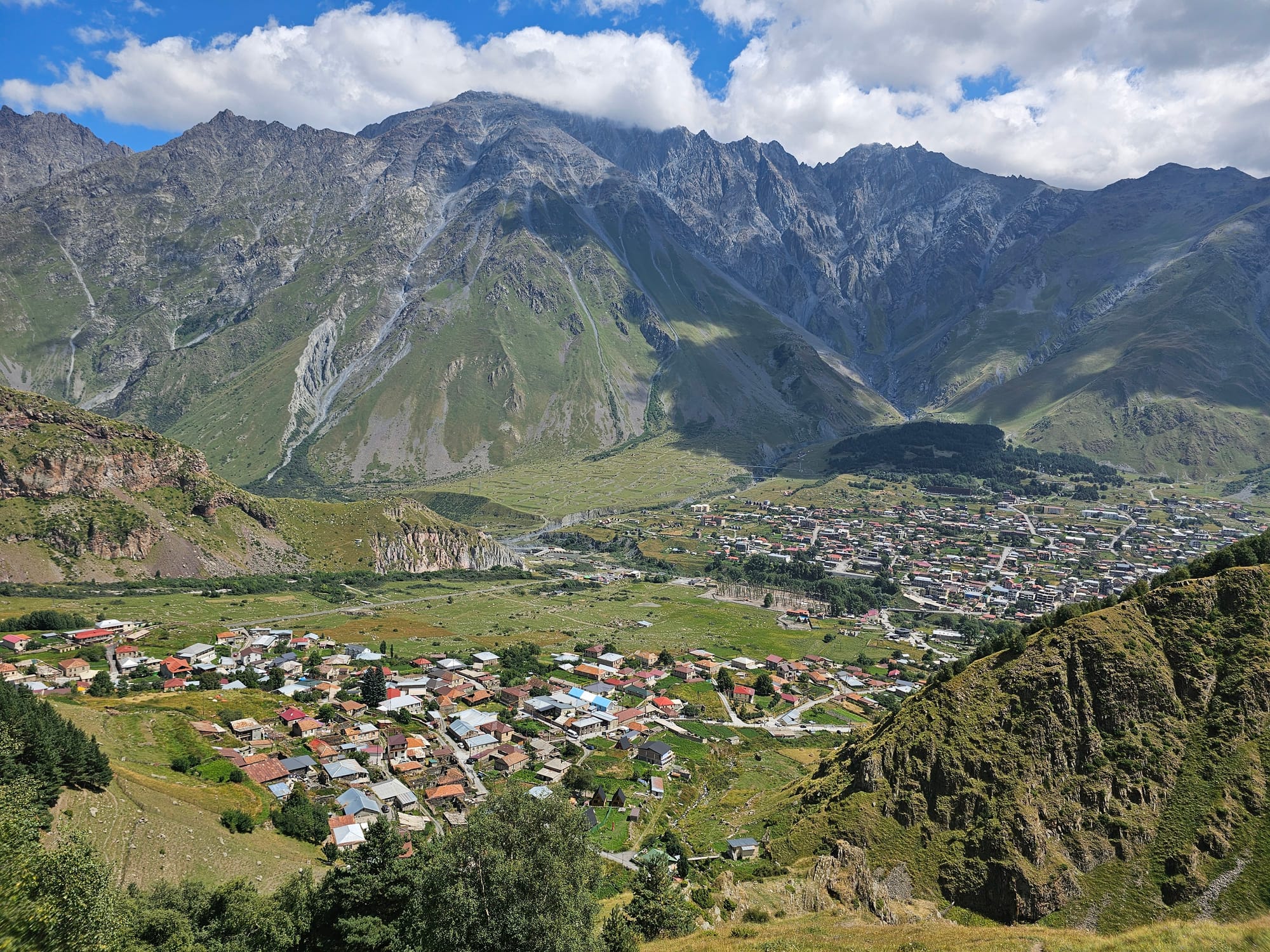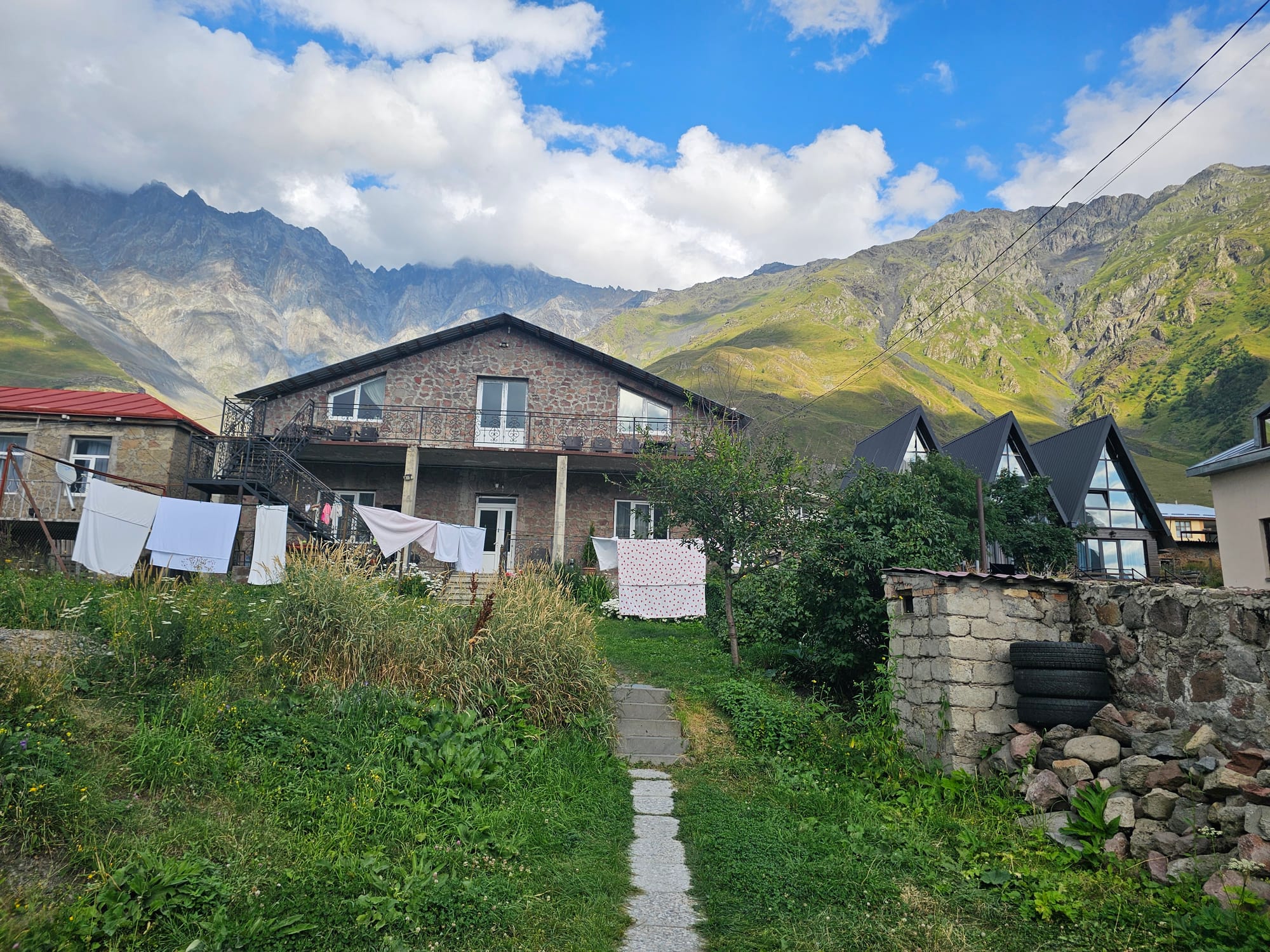 Поездка выдалась сложной. Сперва мне пришлось очень заранее приехать в аэропорт, потому что авиакомпания решила в последний день удвоить мое имя (я все еще беспокоюсь о дороге обратно, но будем решать проблемы по мере поступления). Потом 4 часа в самолете, в которые даже не удалось поспать, потому что как только выключили свет, как раз рядом с нашими сиденьями начался какой-то свист, закончившийся только на посадке. Потом я еще 4 часа ждала в аэропорту маму, рейс которой задержался. Ну и напоследок 4 часа трансфера от Тбилиси до Степанцминды. По пути сделали несколько остановок в красивых местах, но совсем коротких — сил не было.