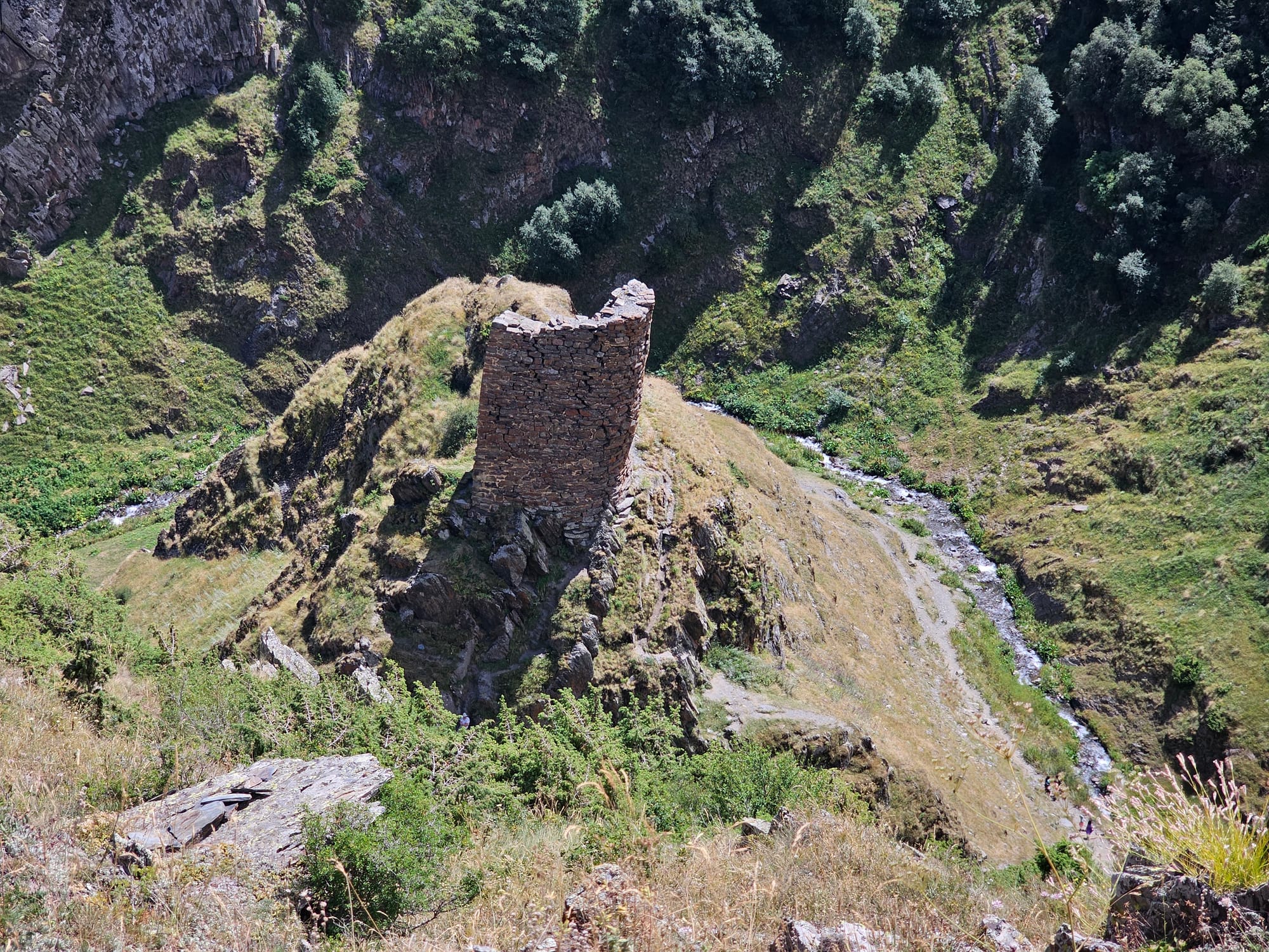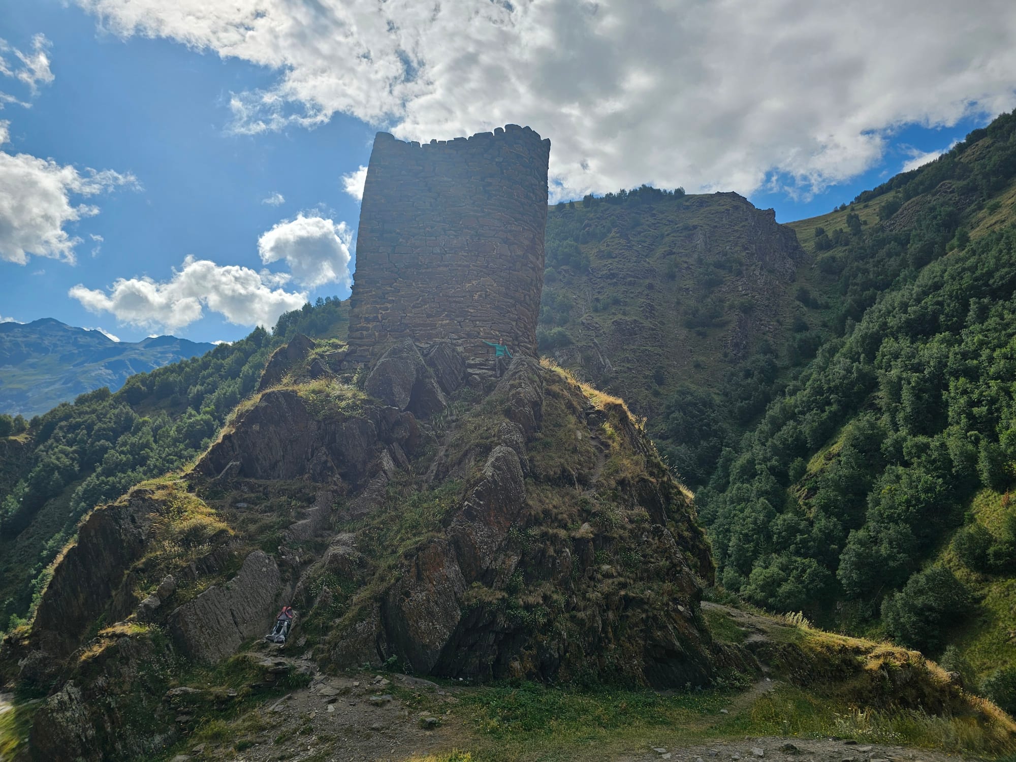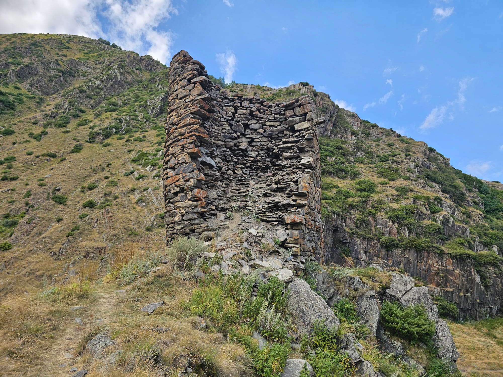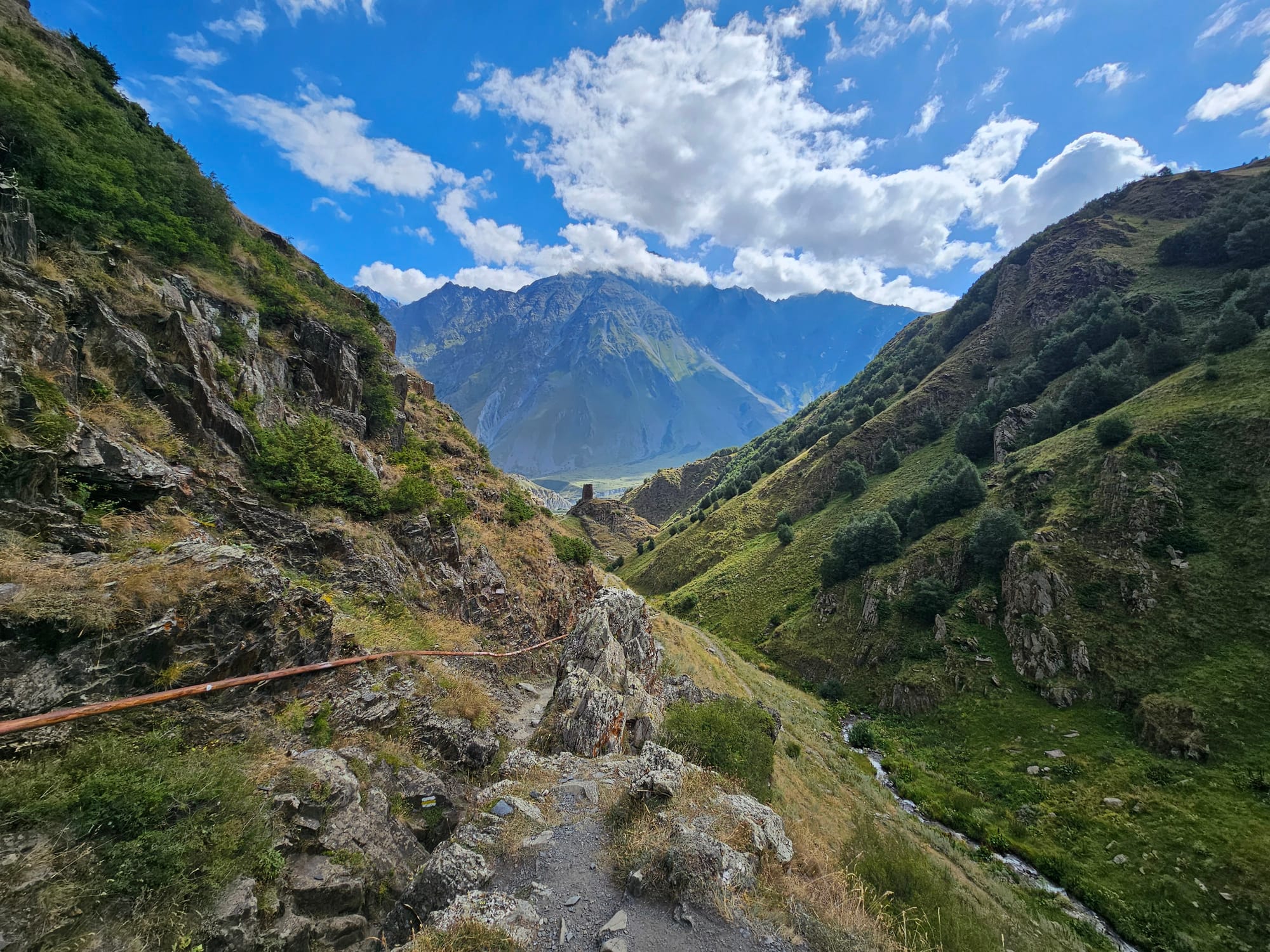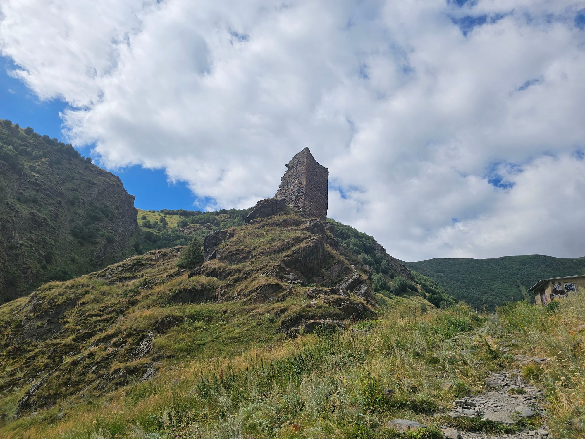 На следующий день пошли на небольшой хайк прям от деревни до Троицкой церкви Гергети. Наверх мы решили идти мимо руин сторожевой башни. Мы и по пути до Степанцминды видели много таких, но издалека. А тут была возможность подойти поближе. Тропа была довольно удобная и хорошо размеченная, но очень пыльная. Как впрочем и все остальные тропы там.