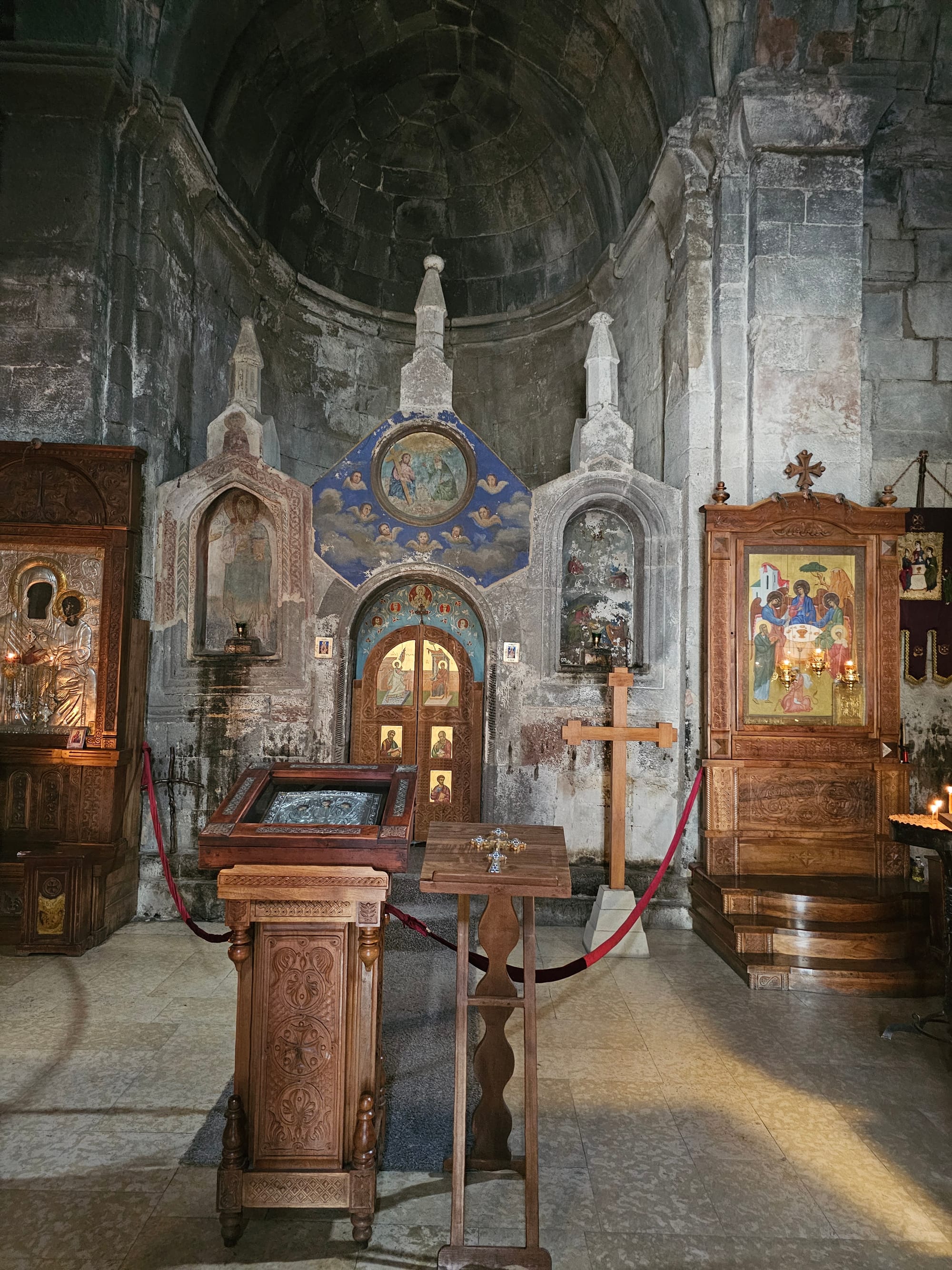 После еще куска подъема мы вышли к цели хайка — Троицкой церкви. К сожалению, оказалось, что одна из башен сейчас ремонтируются, так что вид был испорчен строительными лесами. Но это не помешало посмотреть нам церковь внутри и снаружи.