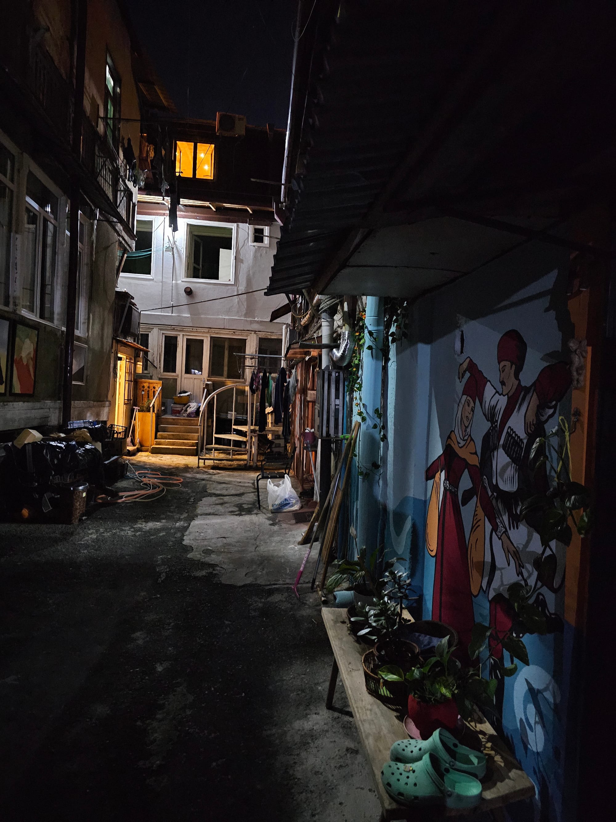 На самом деле времени в первый день было не очень много, мы приехали уже во второй половине дня, так что обратно мы шли уже скорее по темноте, что не останавливало нас от изучения подворотен и подъездов.