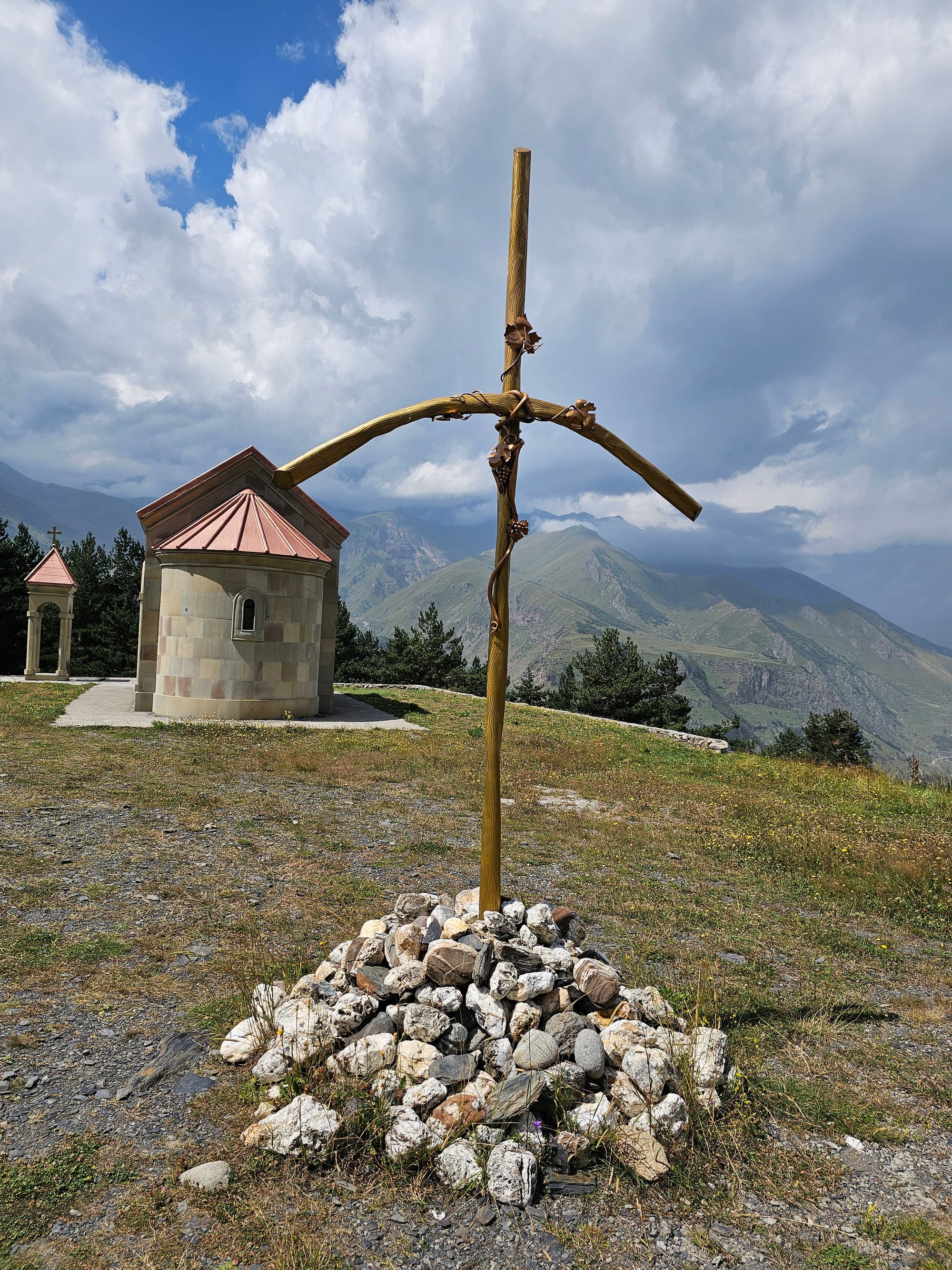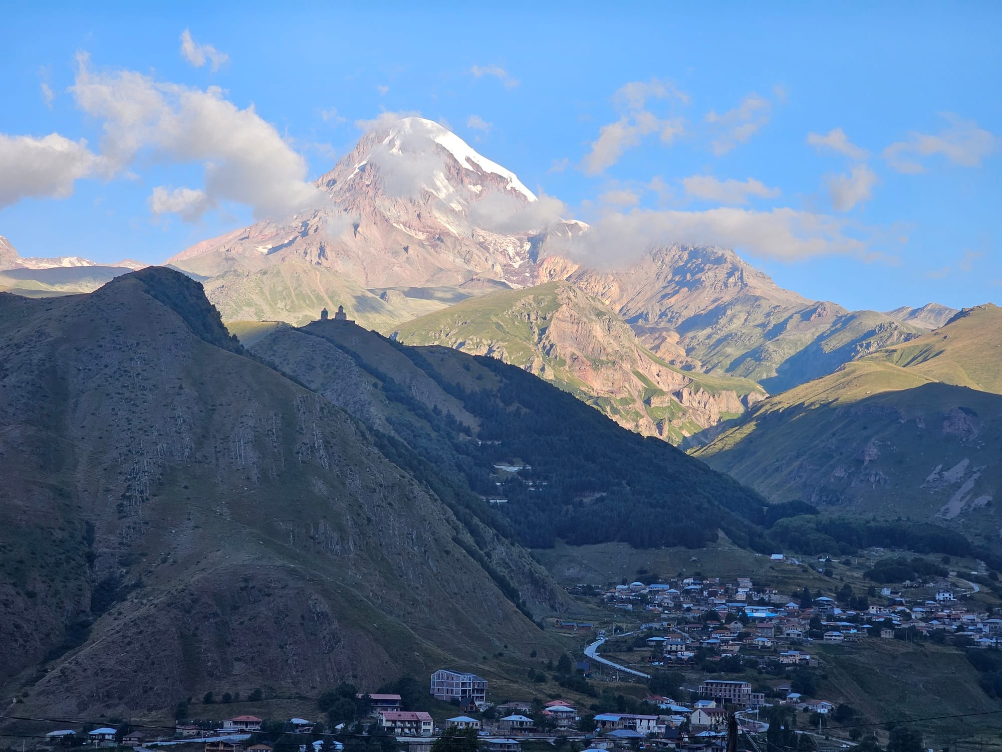 Выйдя утром на терассу нашего домика, мы с удивлением увидели гору, про существование которой в первые два дня даже не догадывались, так хорошо она пряталась в облаках. Причем горы пониже было хорошо видно, просто на них лежало облачное одеяло. Не, мы знали, что где-то там должна быть гора Казбек, самая высокая в регионе, но что она так близко!.. Гора очень быстро снова затянулась облаками, так что любовались мы ей недолго.
