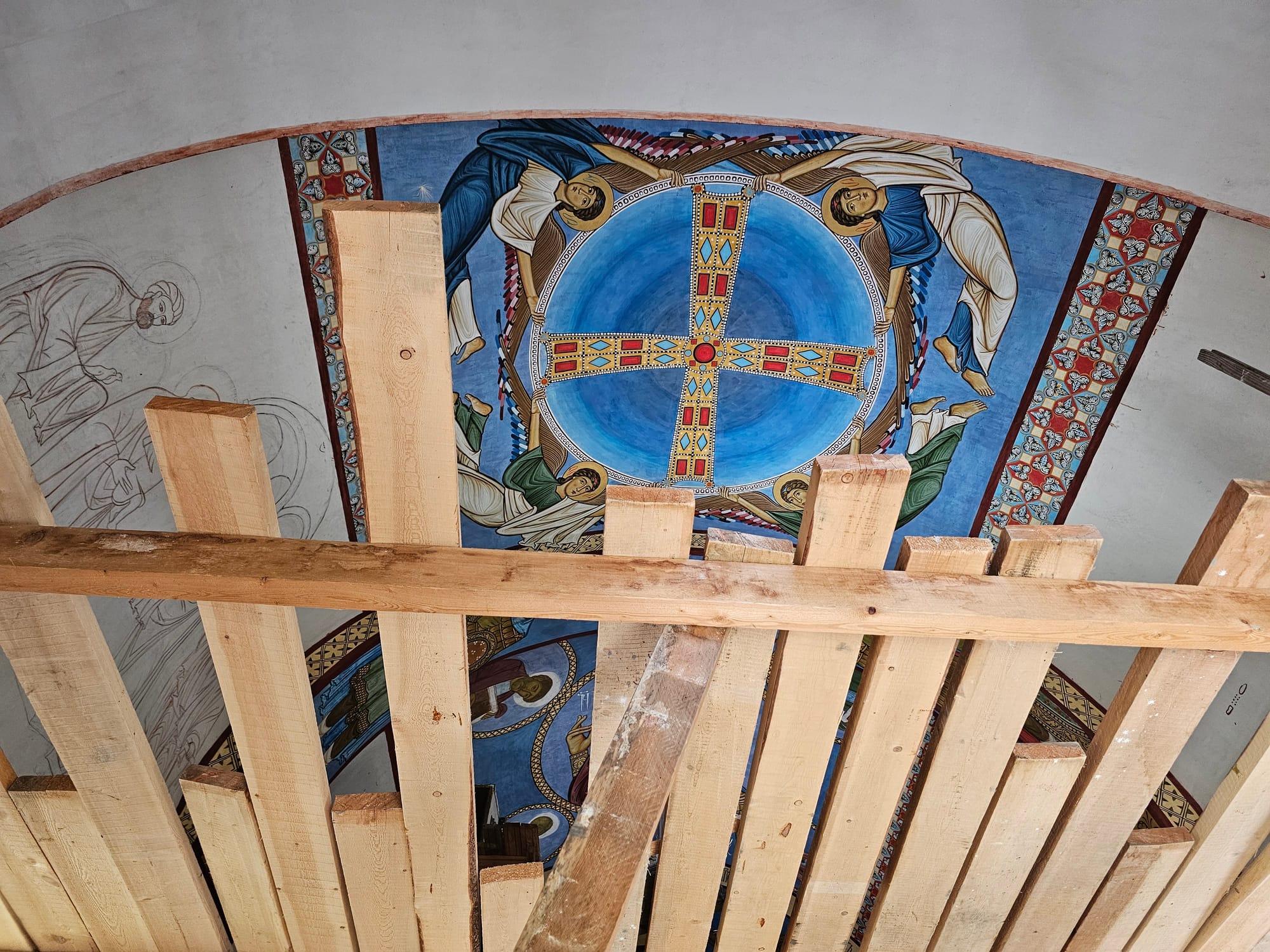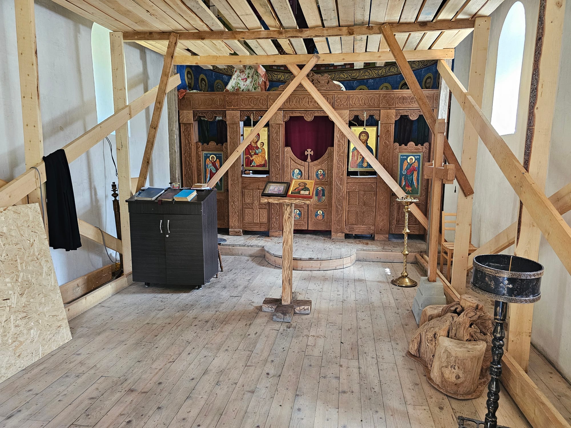 А вот в монастырской кафешке остановились. До самого монастыря не пошли — он был в стороне, а у нас времени было не то что с большим запасом, но заглянули в церковь (она была новая и фрески еще были не дорисованы).