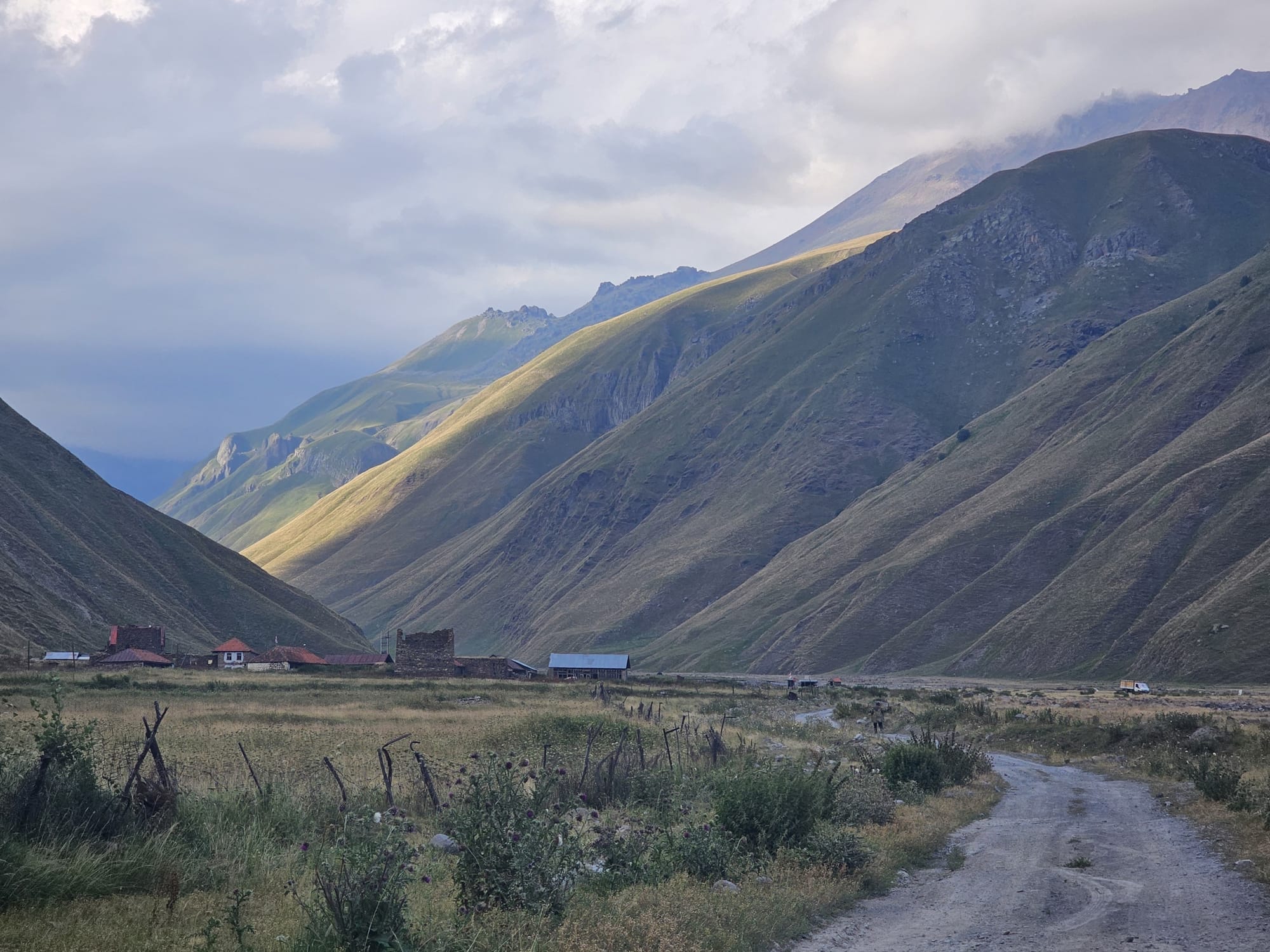Мы долго думали, нужна ли нам машина в этой поездке, потому что только два хайка из запланированных нами были в Степанцминде. Но в интернете нашли, что есть удобный трансфер, так что решили, что обойдемся без. На месте мы выяснили, что у нас два варианта: или договариваться с частниками, или бронировать место в "автобусе" от местной туристической фирмы. Несмотря на название, это вообще не автобусы, а просто минивэны, в которых всего 7 мест, и которые ходят в большинство интересных мест вокруг 1-2 раза в день. Плюсы: довольно дешево и удобно; минусы: жестко привязан ко времени. Мы бронировали предыдущим вечером, поэтому на первый автобус (около 9 утра) мы не попали, пришлось выезжать позже (около 11). Не совсем наш вариант, особенно с учетом того, что еще около часа занимает дорога, но выбора уже не было. Время обратного автобуса строго фиксировано, так что мы переживали, что придется сокращать довольно длинный запланированный маршрут.